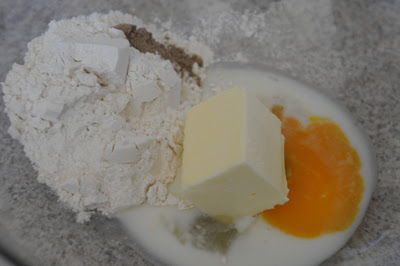 Now preheat your oven to 250 degrees. Add the flour, syrup, egg, salt, butter and cream.